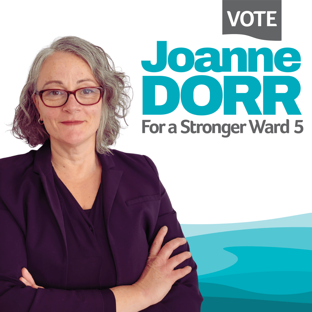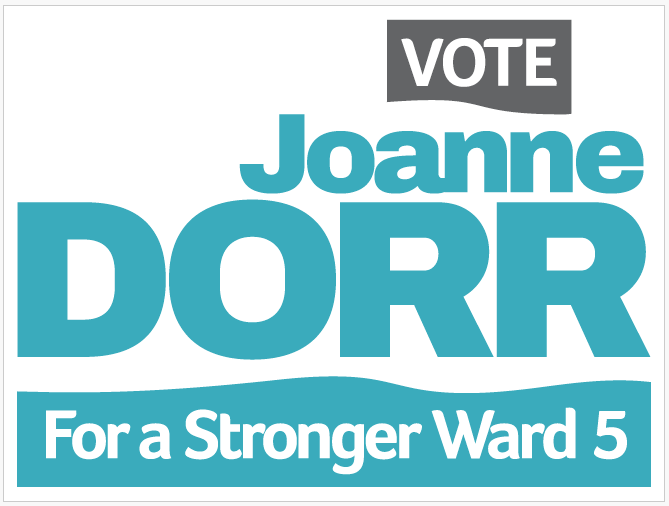 Consider a Joanne Dorr for Ward 5 lawn sign on your property. Just email us, and we will have it to you promptly
